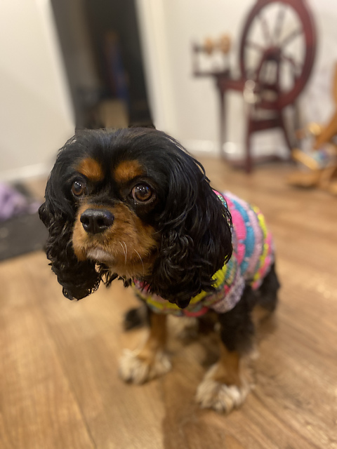 Kylie finished the Westknits Bubble Pup Sweater (ravelry, website) for her little doggie, Sammie. The yarns are mostly a DK mini set from Prosper Yarn and some leftover yarn by Knot N Tie.